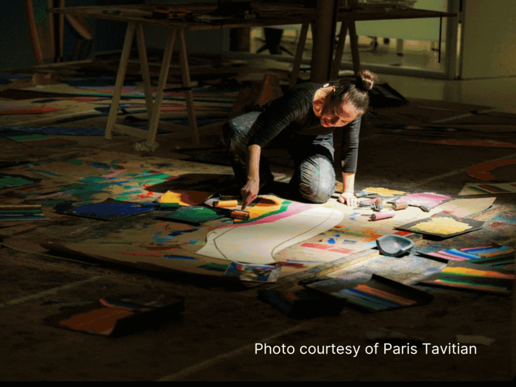 This month’s artist highlight features Hadassah Emmerich, whose practice unfolds across painting, mural, and installation to explore ornament as a vessel of cultural hybridity, memory, and desire. Drawing from Indonesian Batik, Art Deco, and advertising aesthetics, her work treats ornament as both seduction and critique. Through a distinctive transfer technique using hand-cut stencils and layered pigments, Emmerich creates richly textured surfaces where the sensual and the political, the personal and the collective, continuously intertwine.